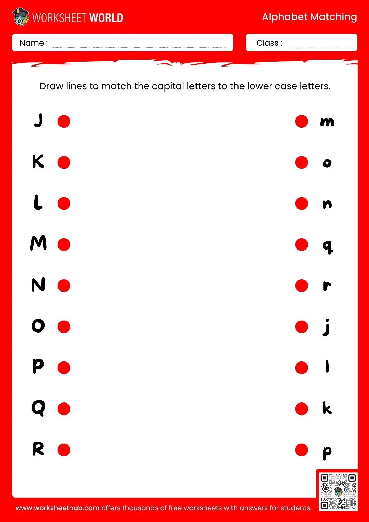 In this activity, students will look at letters from J to R and connect each one with a matching image. This helps improve their memory, alphabet knowledge, and ability to associate letters with common objects. It’s a simple and effective method to make early learning more engaging and fun.