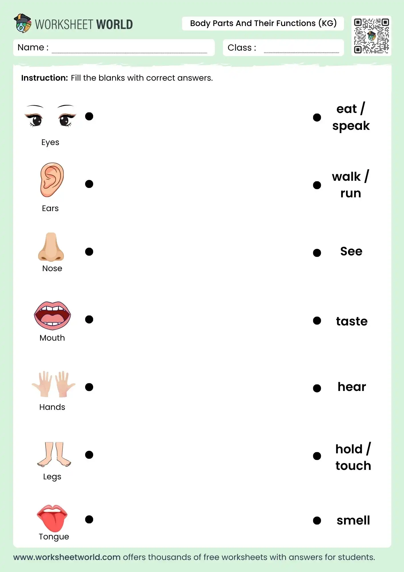 Body Parts And Their Functions For Kindergarten Worksheet With Answers and Free PDF