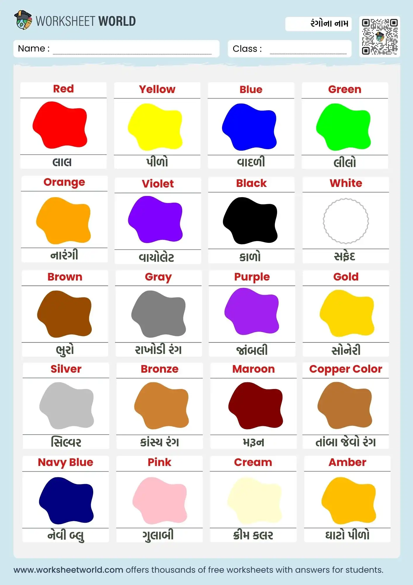 રંગો ના નામ (Colours Name in Gujarati and English) શીખવાથી બાળકોને દૈનિક જીવનમાં દેખાતા વિવિધ રંગોને ઓળખવાની અને તેમને યાદ રાખવાની મજા મળે છે. આ વર્કશીટમાં લાલ (Red), પીળો (Yellow), લીલો (Green) અને વાદળી (Blue) જેવા મૂળભૂત રંગો સાથે અનેક નવા રંગો પણ બતાવવામાં આવ્યા છે. બાળકો માટે આ ચાર્ટ સહેલાઈથી સમજાય અને રોજિંદા વસ્તુઓમાં રંગ ઓળખવાની ટેવ વિકસાવે છે.