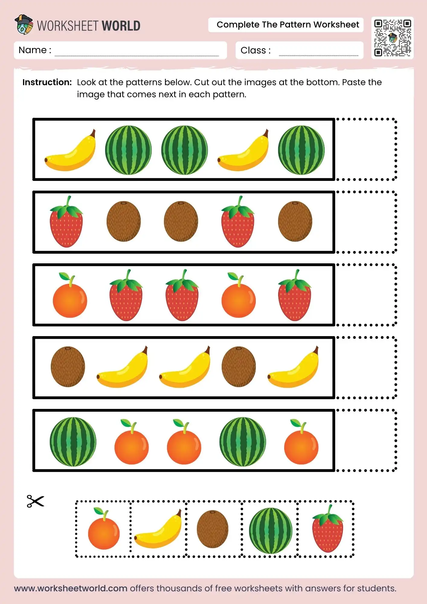 This Complete The Pattern Worksheet helps young learners practise simple fruit patterns using the activities included in the next sections. Children cut out the images provided at the bottom and paste the correct fruit that continues each sequence.