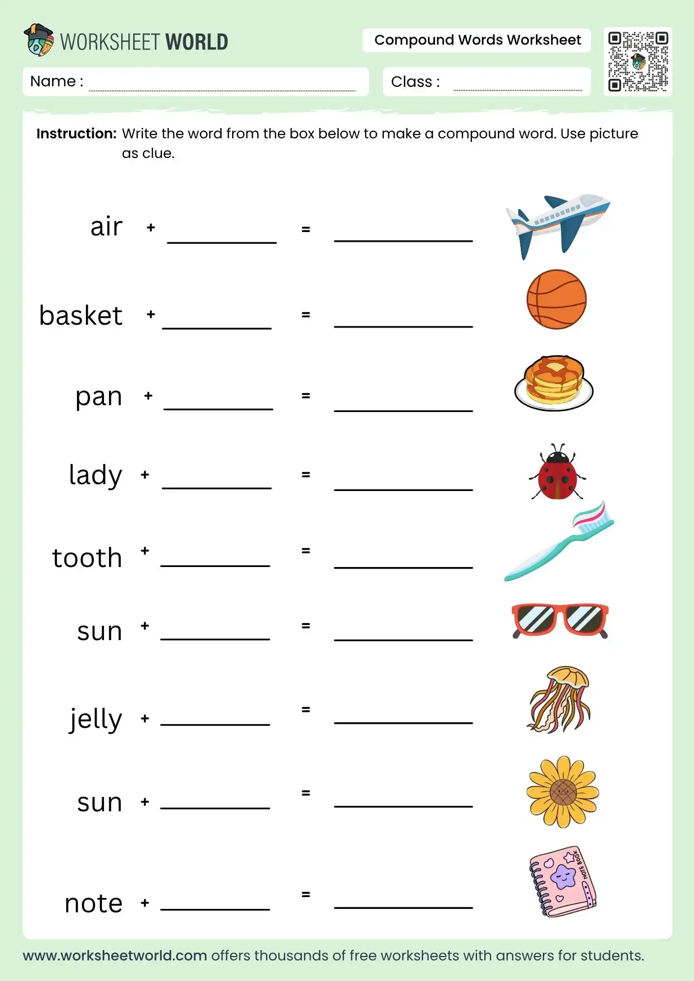 This compound words worksheet pdf is designed for Grade 1 to Grade 3 students to help them learn how two small words combine to form a meaningful new word. With picture clues and simple writing tasks, children can easily understand how compound words are formed while practicing spelling and vocabulary.