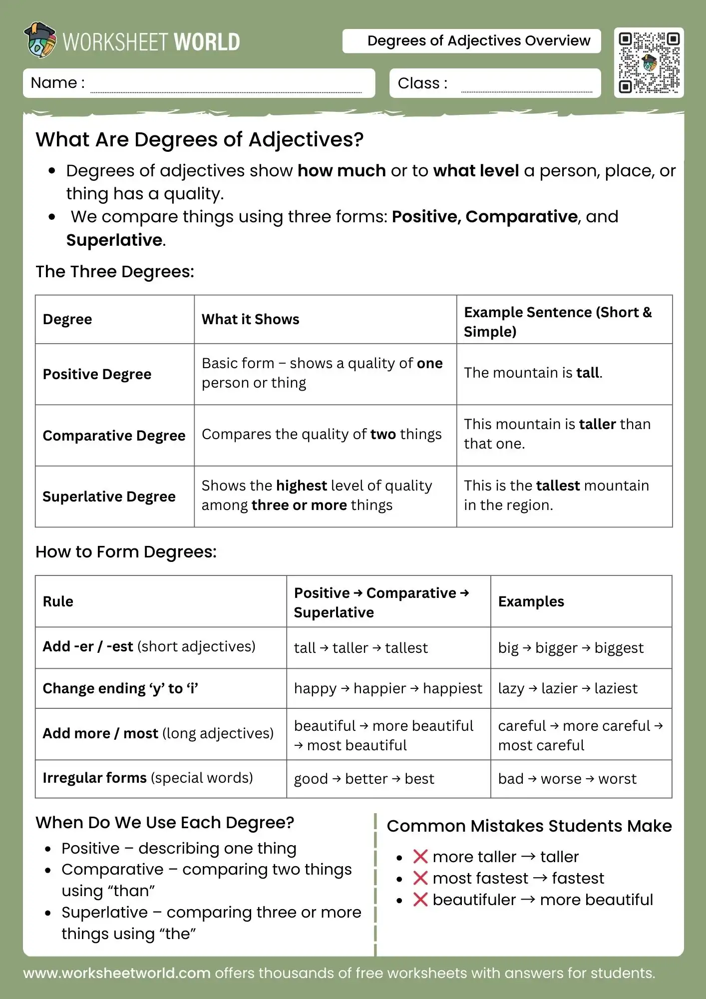 This degrees of adjectives worksheet explains how describing words change in simple comparison. Students learn positive comparative and superlative forms through short examples and rules. The chart helps children understand each degree quickly for stronger grammar skills.