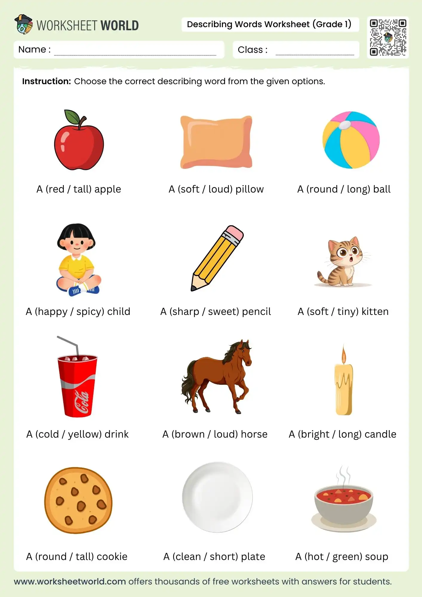 This describing words for class 1 worksheet offers a simple and engaging way for children to learn adjectives. The picture-based choices help students quickly identify the correct describing word. With regular use, kids develop stronger grammar, better vocabulary and improved observation skills while enjoying each activity.