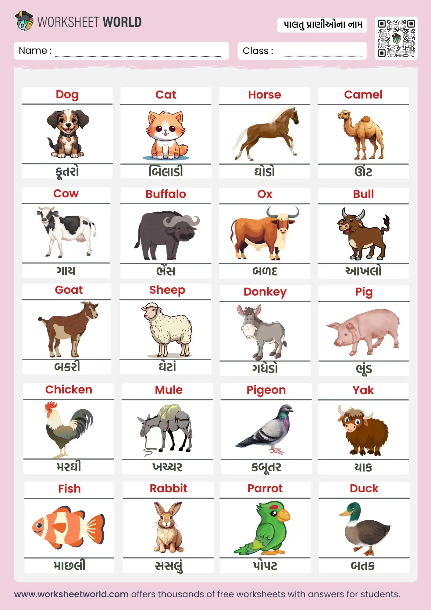 આ વર્કશીટ ચાર્ટ સ્વરૂપમાં છે જેમાં વિવિધ ઘરેલુ પ્રાણીઓના નામો અને ચિત્રો બતાવવામાં આવ્યા છે. તેથી અહીં કોઈ પ્રશ્નો કે જવાબો આપવાના નથી. બાળકો ફક્ત ચિત્ર જોઈને નામો શીખી શકે છે અને પ્રાણીઓની ઓળખ કરી શકે છે.