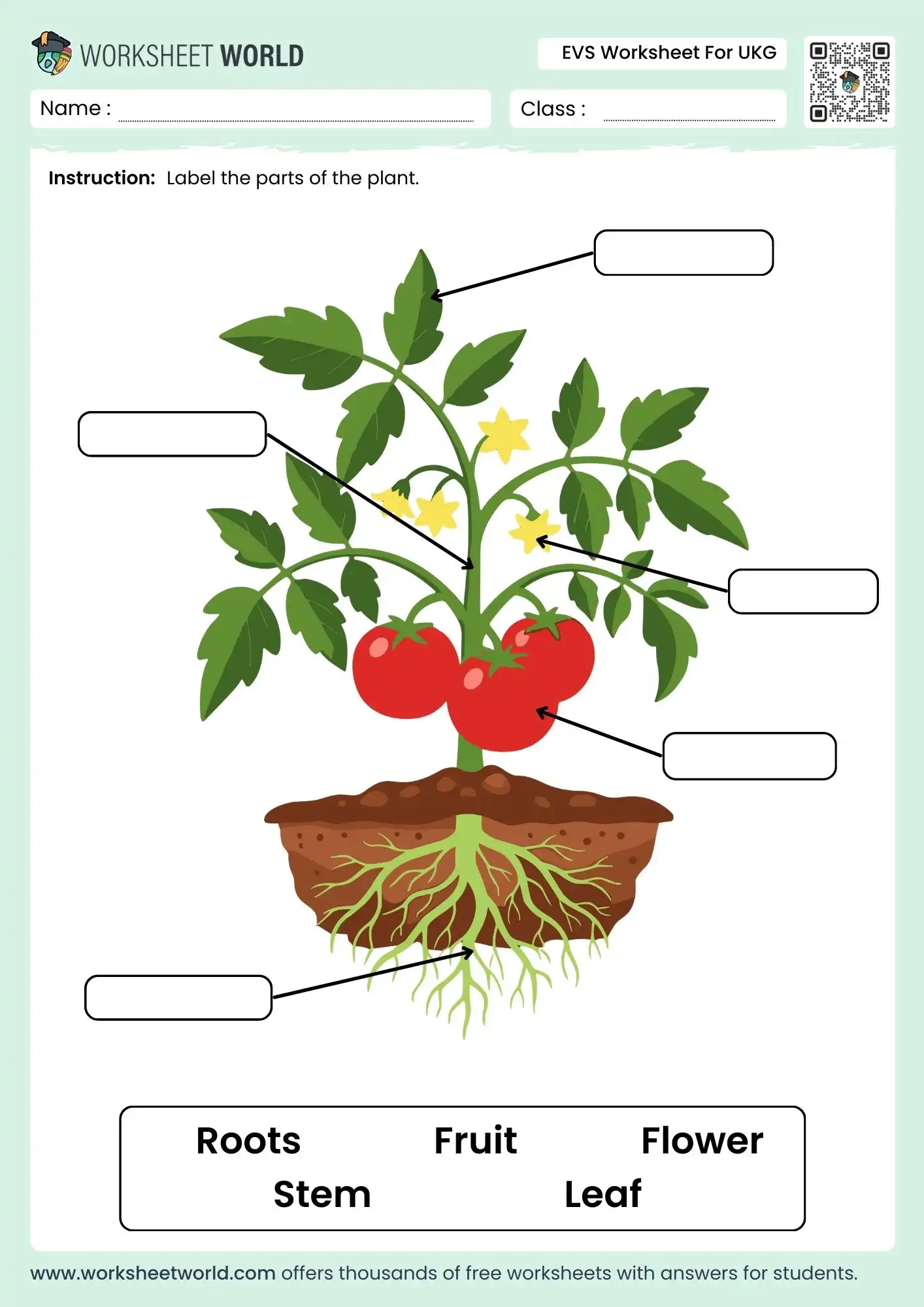 This evs worksheet for ukg introduces children to plant parts through a clear labeling activity. The worksheet supports early science learning, visual recognition, and vocabulary building. It is ideal for both classroom teaching and home practice.