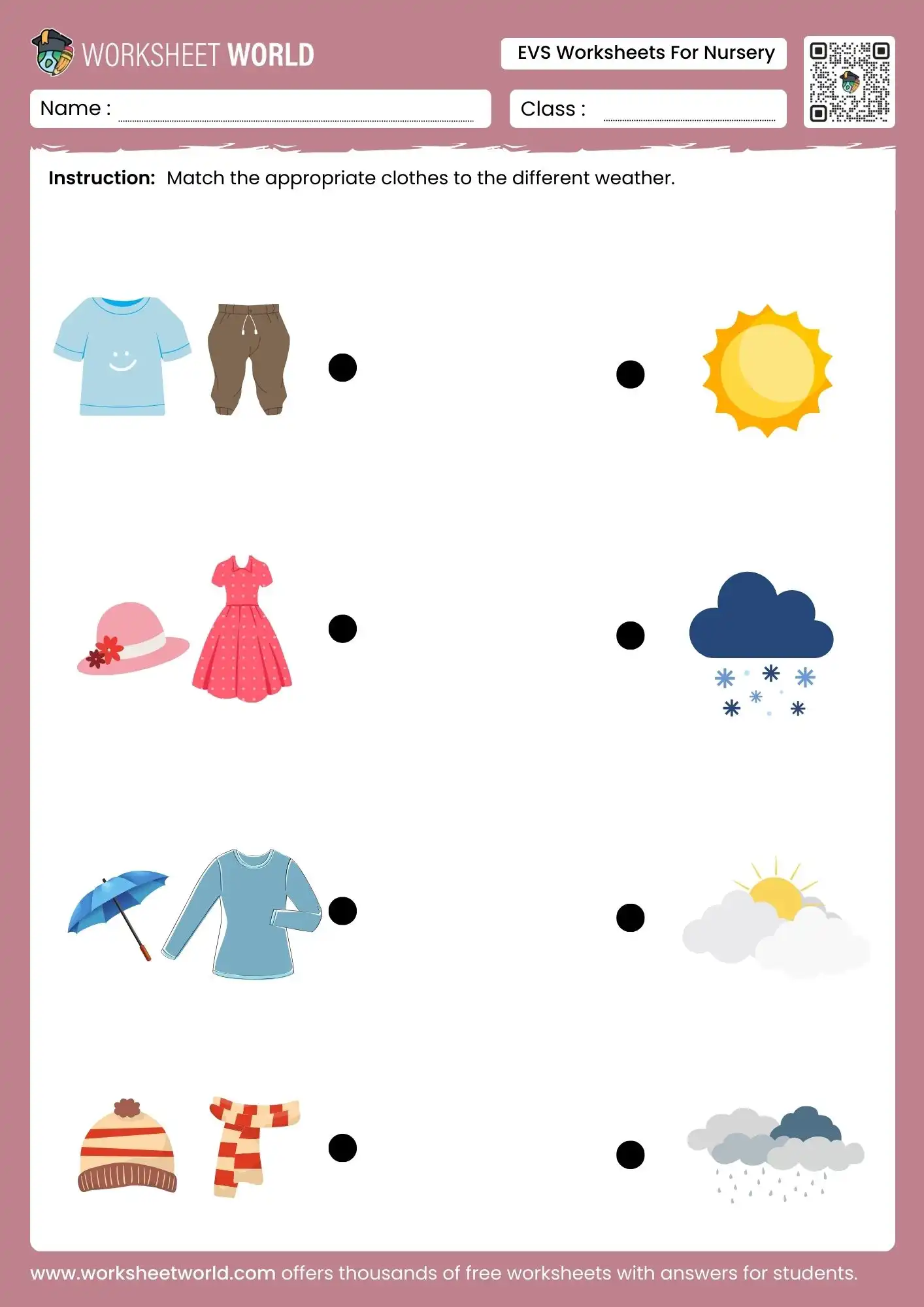 This evs worksheets for nursery article provides a weather-and-clothes matching activity perfect for young learners. Kids understand seasons, match suitable clothing, and build real-world awareness through simple visual learning. A helpful printable worksheet with answers makes it great for both classroom and home use.