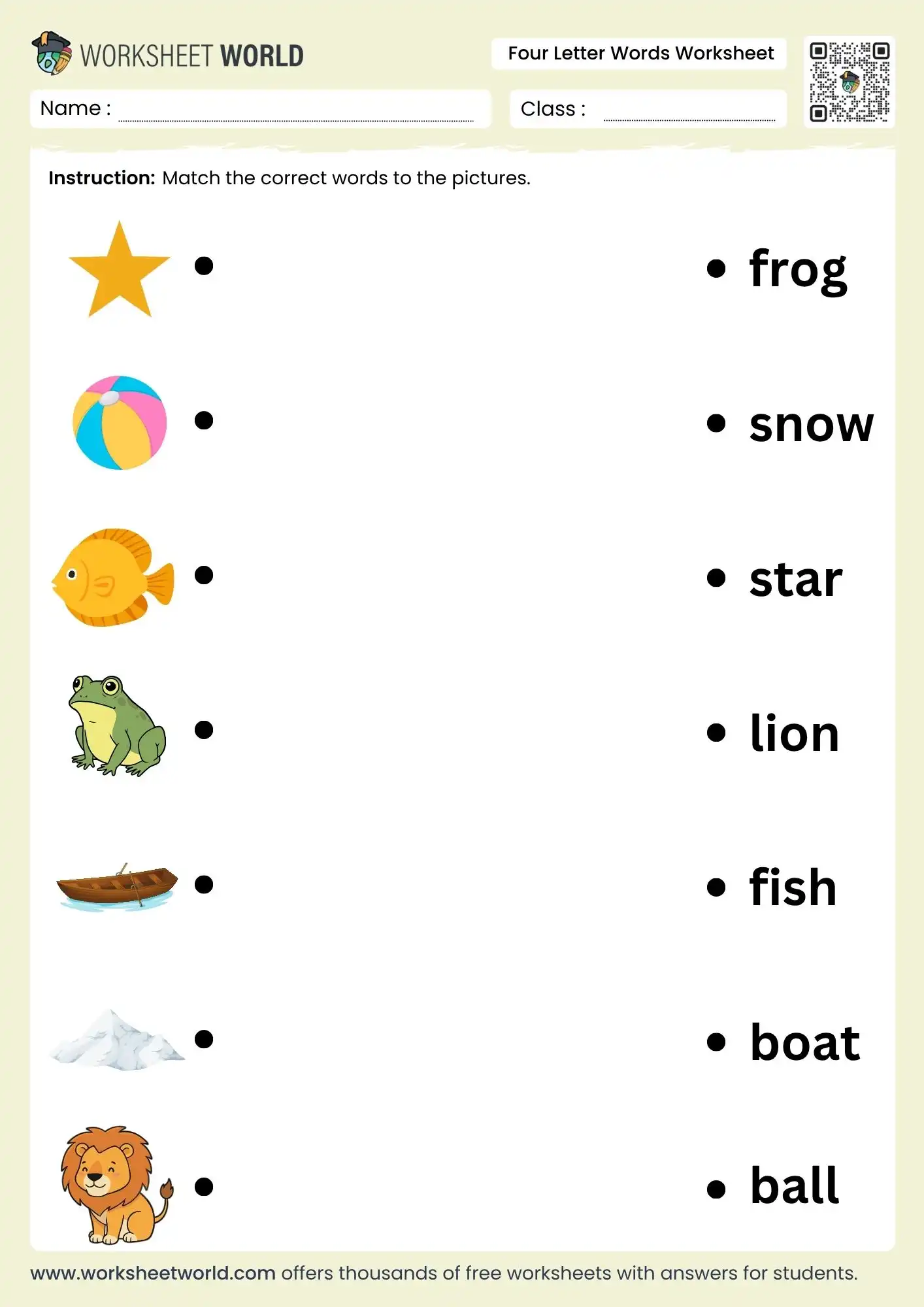 These four letter words worksheets help young learners in Kindergarten, Grade 1 and Grade 2 recognize simple four-letter words using picture matching activities. With clear visuals and easy vocabulary, children can practice reading skills while identifying familiar objects.
