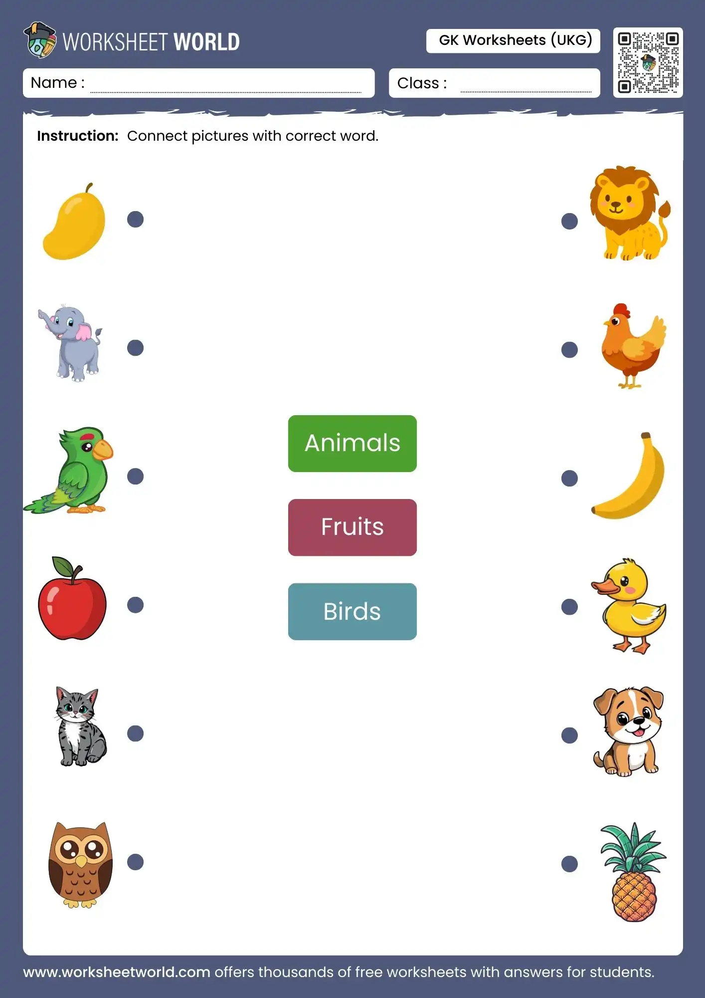 This GK worksheets for UKG set offers a fun matching activity where children identify fruits, animals, and birds. The visuals are simple and clear, making it easy for young learners to complete the task confidently. With answers included, it becomes a perfect tool for both parents and teachers to support early learning.