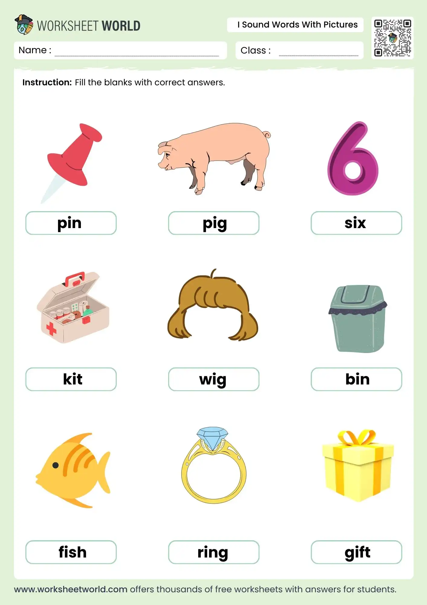This worksheet helps children practise short vowel sounds, recognise simple words, and connect pictures to spellings. It improves phonics understanding, strengthens early reading skills, and builds confidence in identifying short “i” sound words.