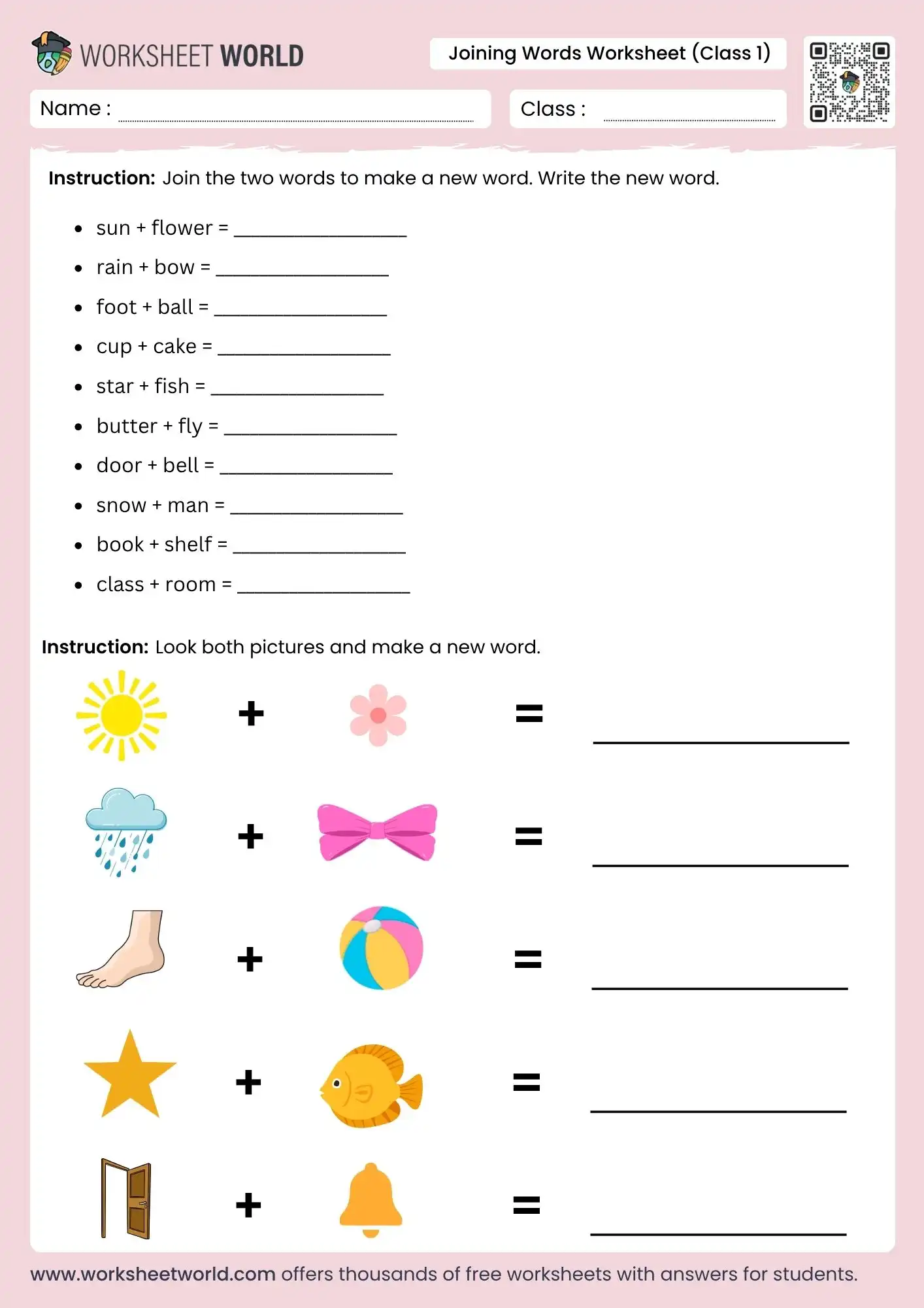 A joining words worksheet for class 1 helps children combine two simple words into a new compound word through pictures and easy examples.