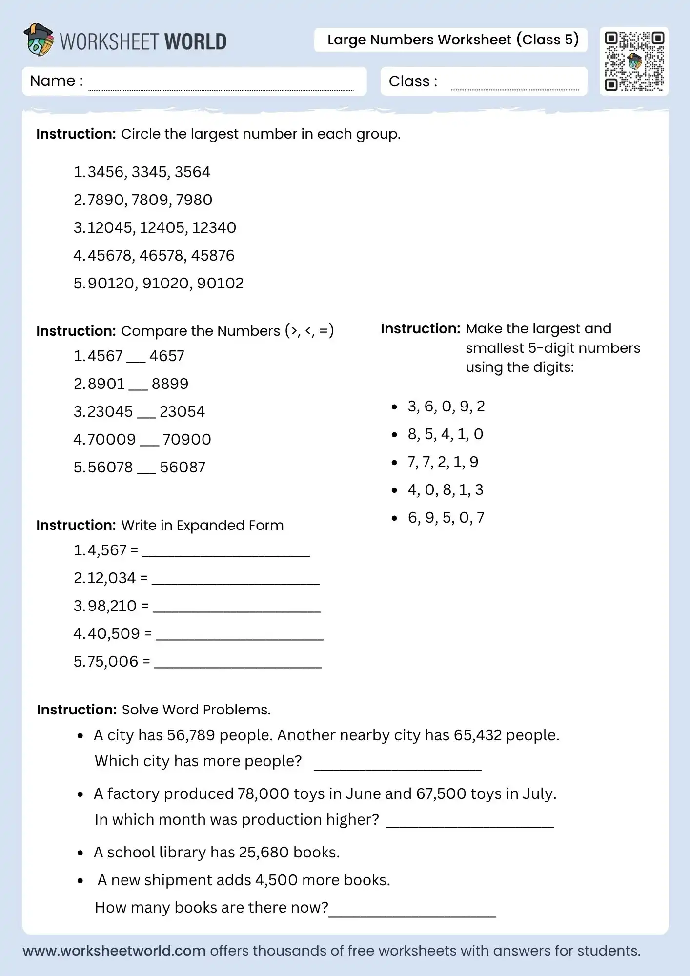 Large Numbers Worksheet For Class 5 offers structured tasks that build confidence in reading and comparing multi-digit numbers. Students strengthen place-value skills, learn expanded forms, and solve simple real-world problems. These worksheets are ideal for practice both in class and at home.