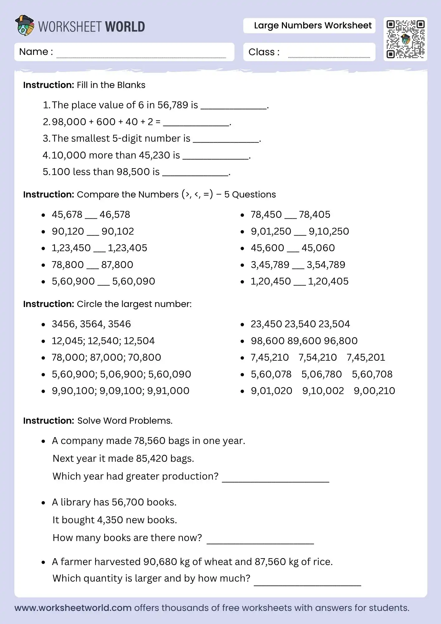 This Large Numbers Worksheet helps students practise place value, comparing numbers, circling the largest number, and solving word problems through clear, structured exercises. These activities support number understanding and build confidence while working with bigger values.