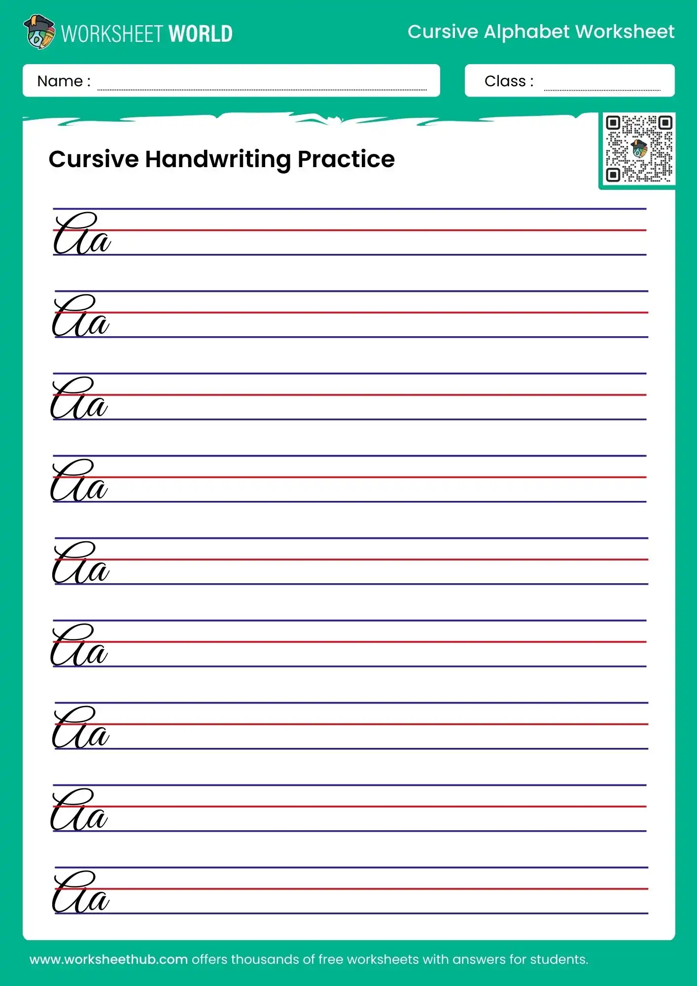 Early writing skills build the foundation for a child’s ability to express through words. Tracing lines and letters not only improves handwriting but also develops muscle control and coordination. By repeating the same letter in cursive format, children gradually build memory and pattern recognition. It’s also a calming and focused task that supports concentration in young learners. With guided dotted lines and enough space to practice, this worksheet is ideal for both teaching and revision.