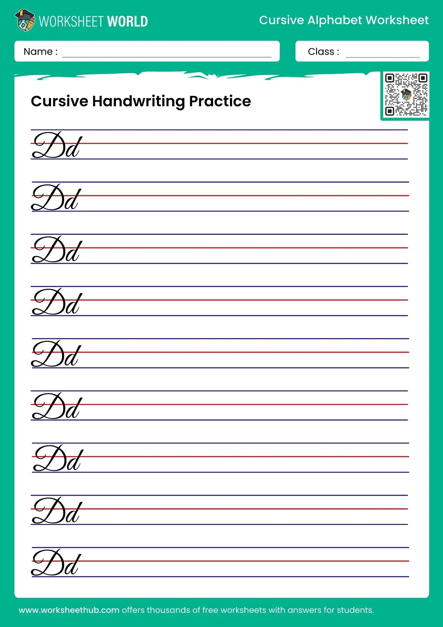 Learning cursive writing becomes exciting with these easy-to-use letter d cursive handwriting worksheets. Designed for preschool, nursery, LKG, and UKG students, this sheet introduces young learners to the basics of writing the letter d in cursive. Children can follow the guided strokes to trace both capital and small versions, helping them improve hand movement, grip, and letter recognition. Whether used in a classroom or at home, this worksheet is a great way to start the cursive journey with confidence.