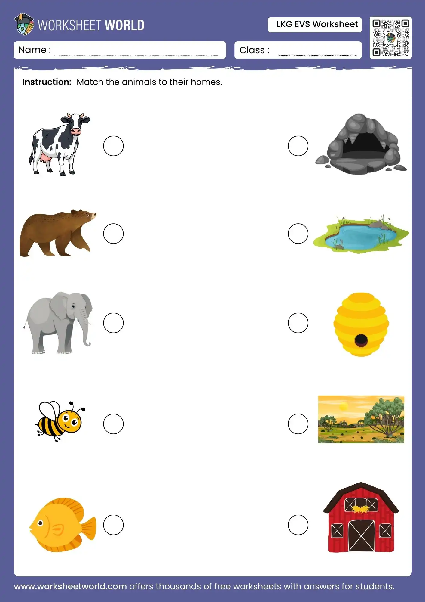 This lkg evs worksheet introduces children to animals and their homes using simple matching activities. The visuals help kids learn quickly and enjoyably. It is suitable for classroom teaching as well as home learning for early graders.