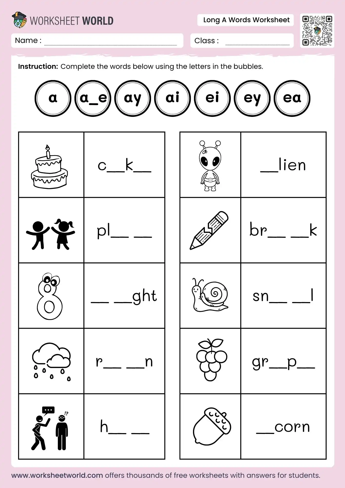 This worksheet encourages learners to complete the missing letters using the long “A” spelling patterns. Here are the correct answers filled in: