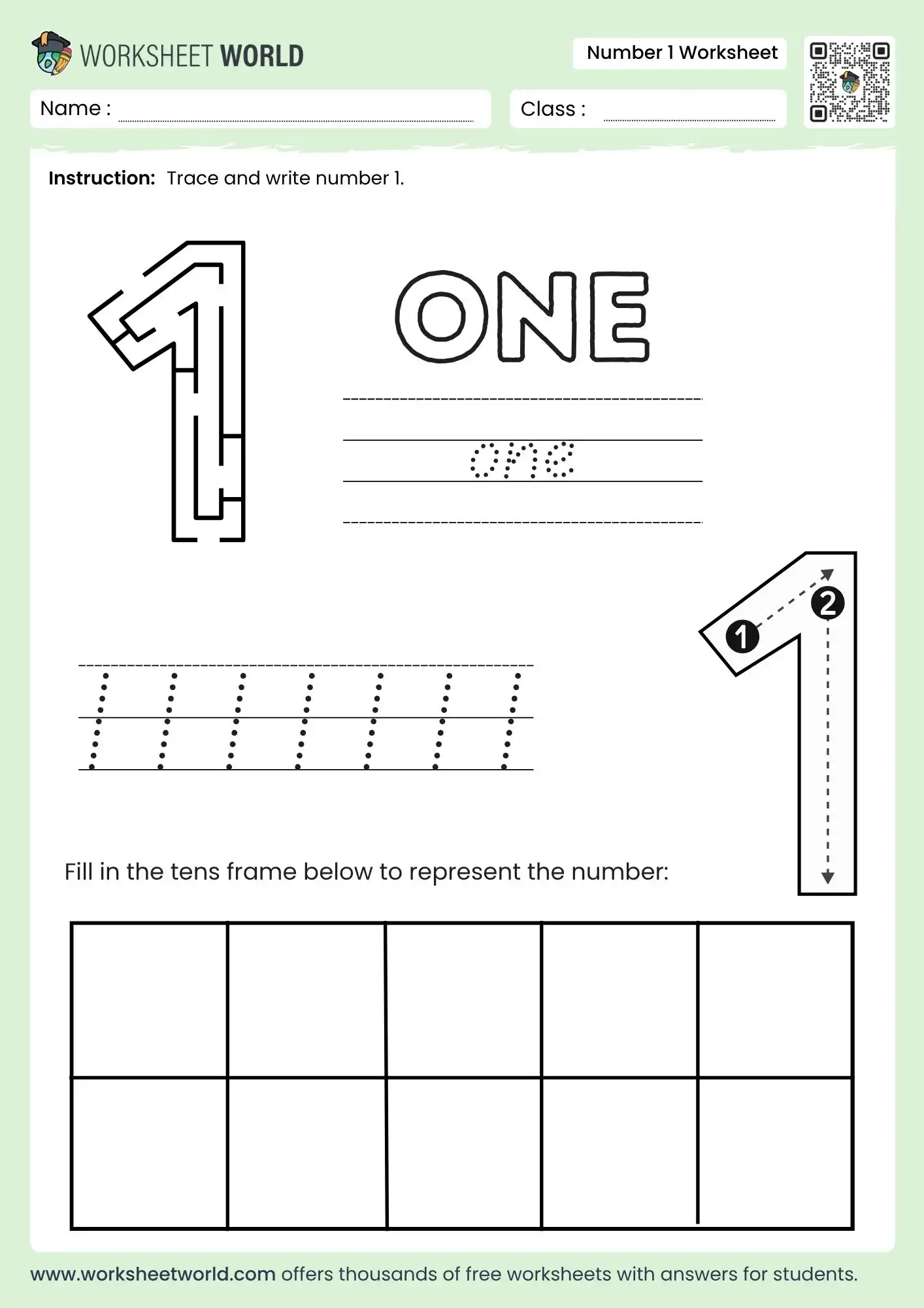 This worksheet helps children learn to trace and write the number one, understand its spelling, and represent it visually in a tens frame. It builds early counting confidence, improves pencil control, and supports number recognition in a simple, engaging format.
