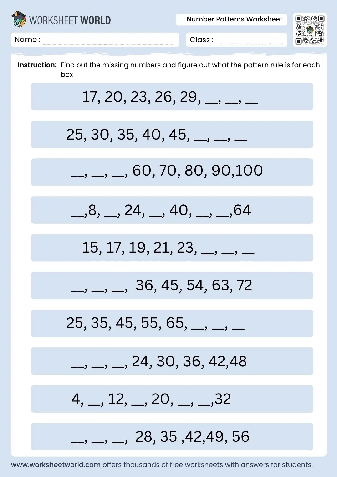This worksheet helps children understand how number sequences work and how to identify the rule behind each pattern. Learners improve logical thinking, prediction skills, and number fluency, which are essential for solving higher-level math problems in future grades.