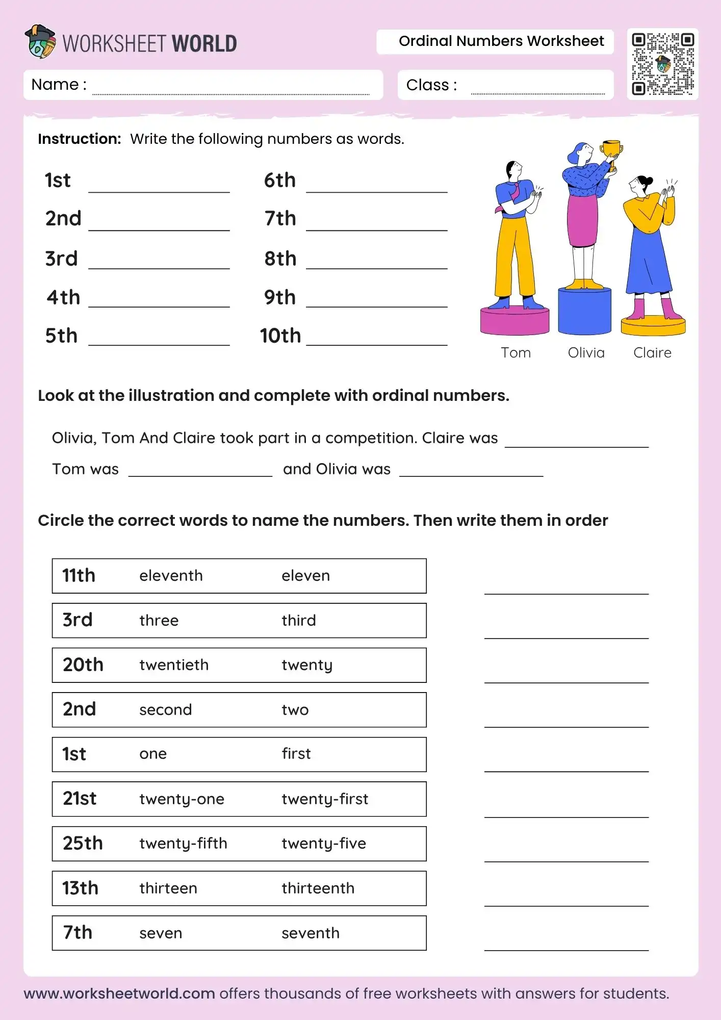 This Ordinal Numbers Worksheet helps children practice writing position words, matching number forms, and understanding order through simple and engaging activities. These printables support early math skills for Grade 1, Grade 2, and Grade 3 learners.
