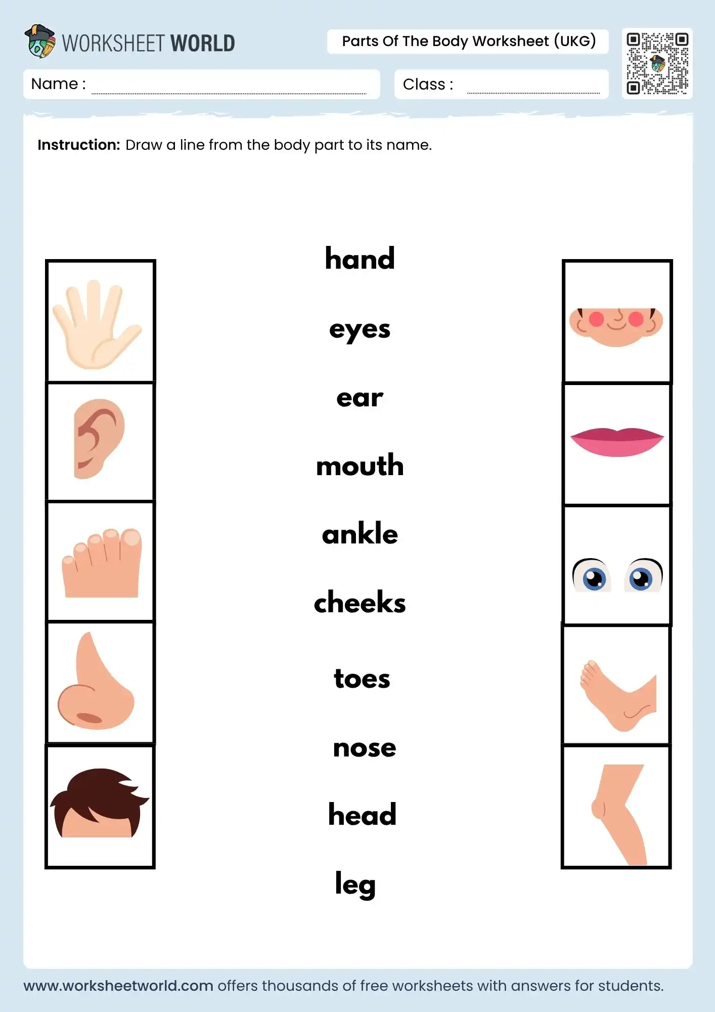 This parts of the body worksheet for UKG helps young learners recognise everyday body parts through a simple matching activity. Kids look at the pictures on both sides and draw a line to the correct word in the centre, making the exercise easy and enjoyable.