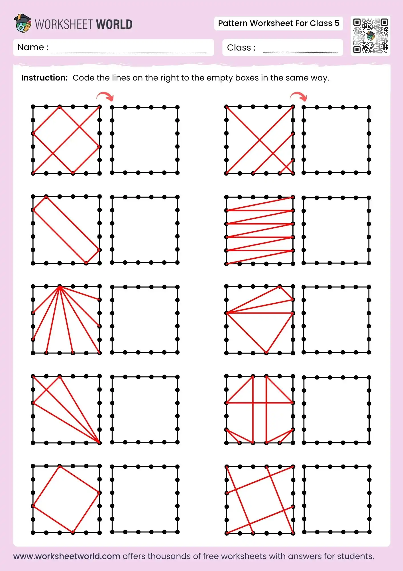 This worksheet strengthens logical thinking by encouraging students to observe, analyse, and replicate coded line patterns. Each square uses a combination of straight, slanted, or crossed lines, helping children understand geometric pattern behaviour.