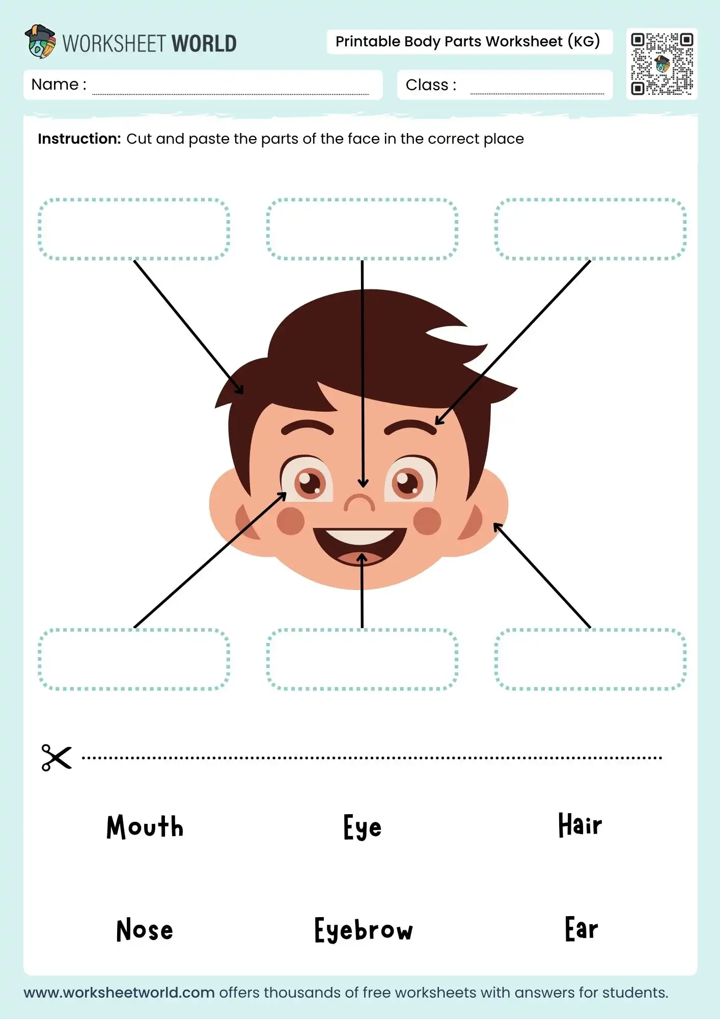 This printable body parts worksheet for kindergarten helps young learners recognise the main parts of the face through a simple cut-and-paste activity. With clear arrows, labelled boxes, and easy word choices, it supports early reading, matching, and fine motor skills in a fun, classroom-friendly format.
