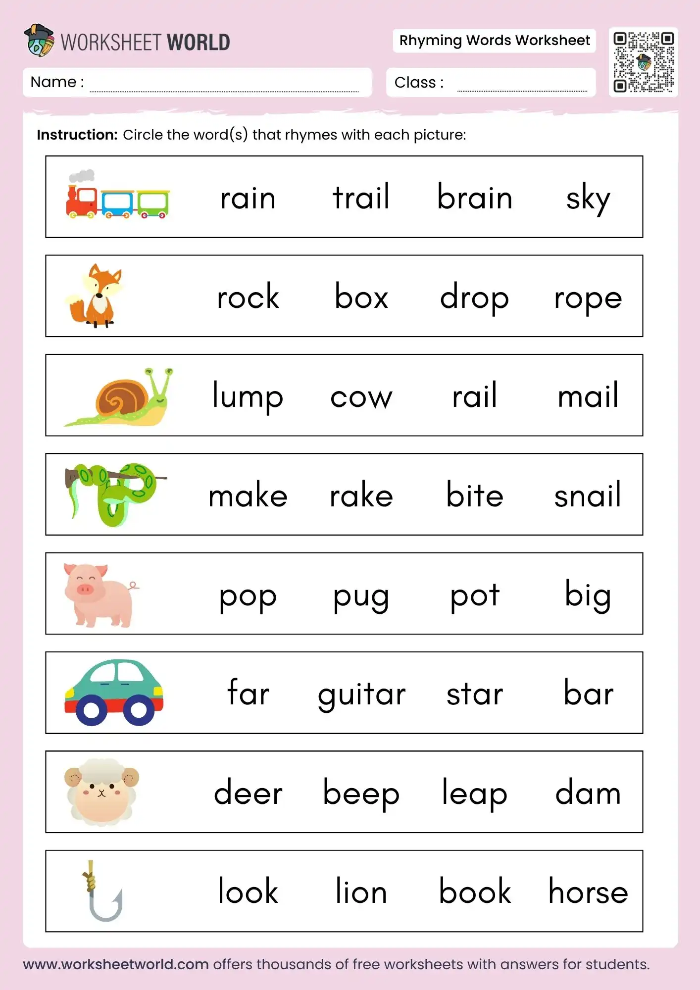 This worksheet helps children strengthen sound recognition, practice phonemic awareness, identify similar ending patterns, and improve early reading fluency. By matching rhyming words with pictures, kids develop stronger listening, decoding, and vocabulary skills that support confident reading growth.