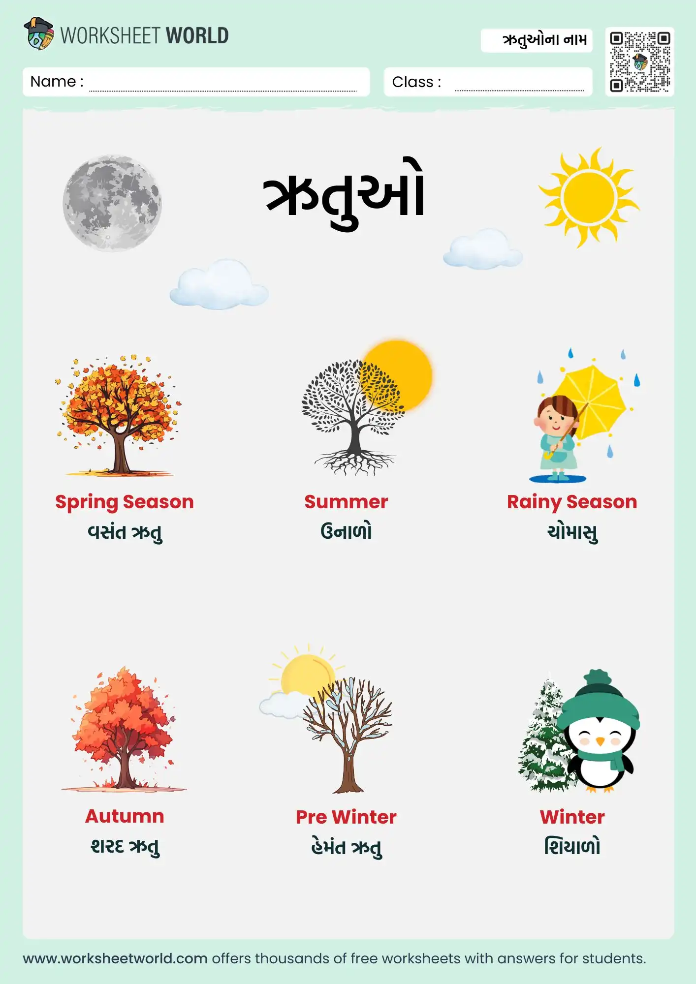 ઋતુઓના નામ (Seasons Name in Gujarati and English) ચાર્ટ બાળકો ને વર્ષ ના સમય અને પરિવર્તન ની સમજ આપે છે. દરેક ઋતુ સાથે સુંદર ચિત્ર અને નામ આપેલા છે જે શીખવાનું સરળ બનાવે છે. આ worksheet શિક્ષકો અને માતા-પિતા માટે શિક્ષણાત્મક સાધન રૂપે અત્યંત ઉપયોગી છે.