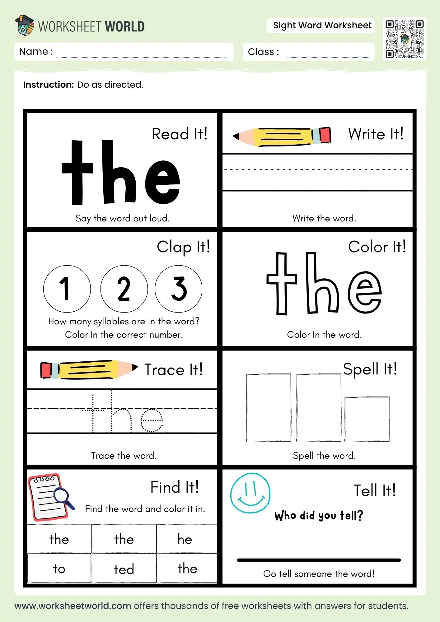 This worksheet helps children recognise, read, trace, spell, and identify a sight word through multiple sensory activities. It builds fluency, strengthens early reading skills, and increases confidence in word recognition.
