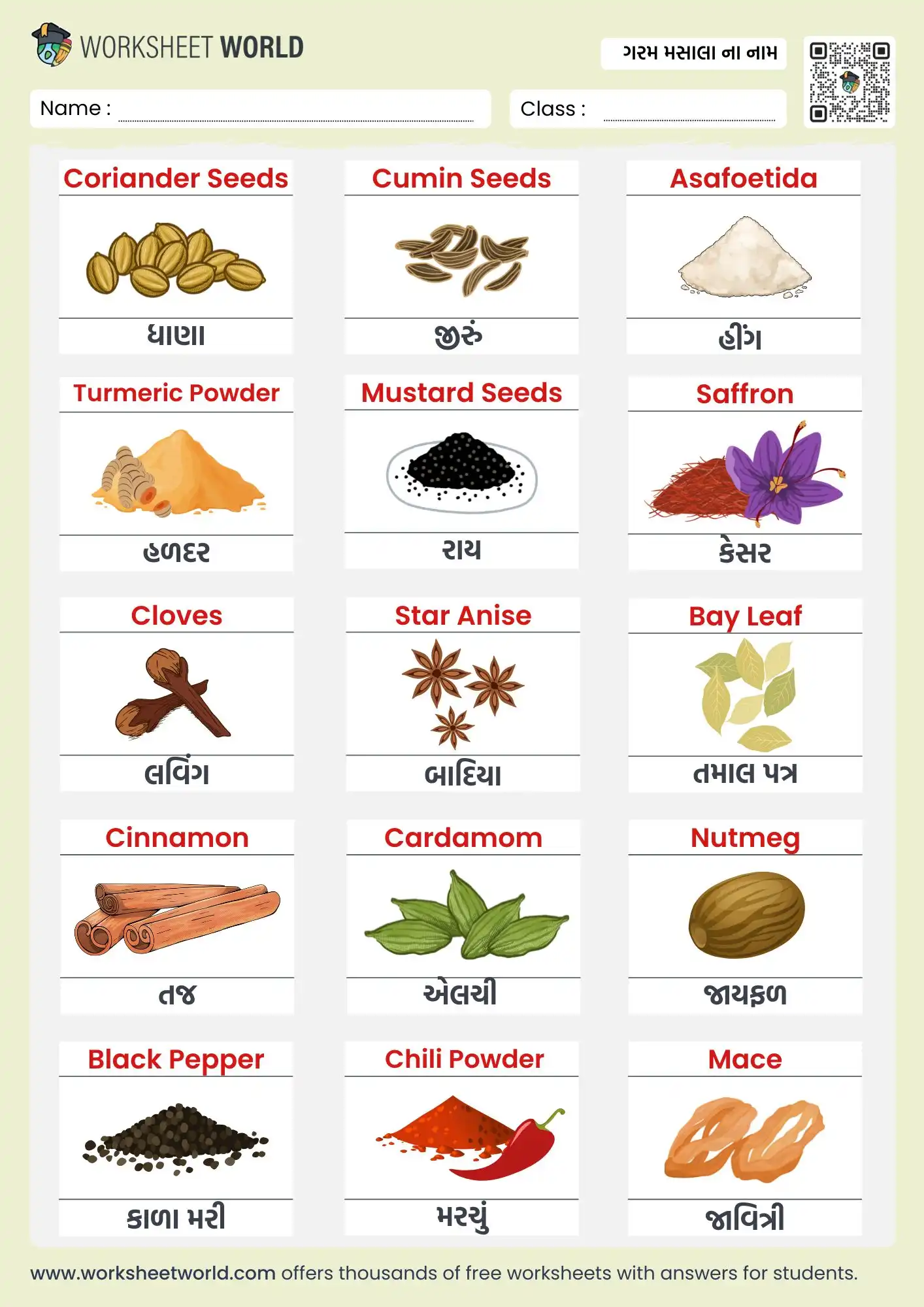 આ worksheet માં ભારતીય રસોઈમાં ઉપયોગ થતા 15થી વધુ મુખ્ય મસાલાઓના નામ આપેલા છે.