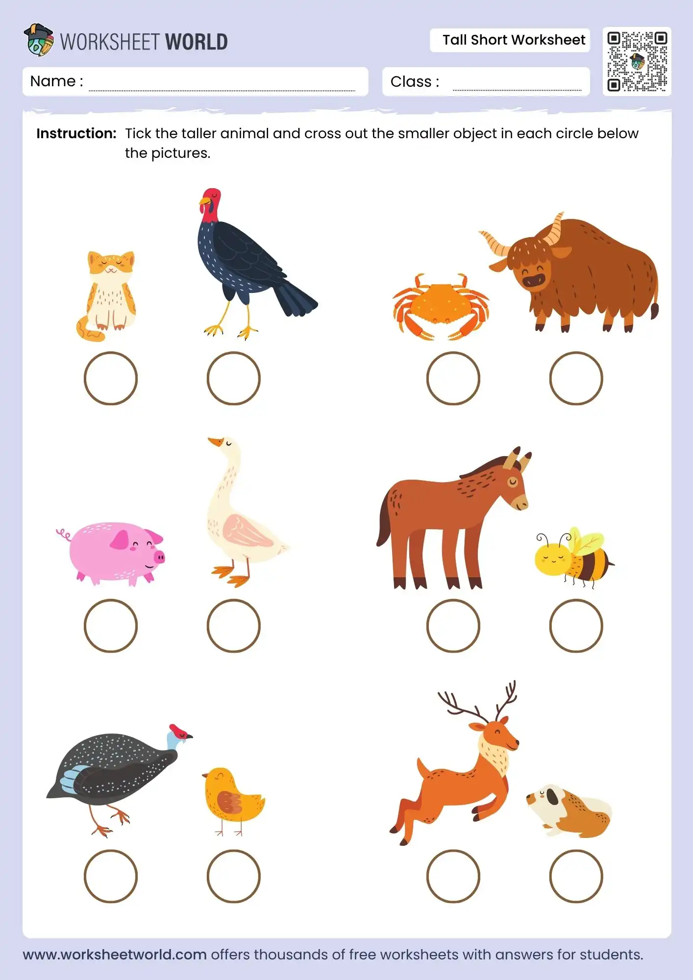 This Tall Short Worksheet helps young learners compare heights through simple picture-based activities, and the extra tasks included later make the learning experience more interactive and enjoyable. Children tick the taller animal and cross out the shorter one in each pair, improving early visual understanding.