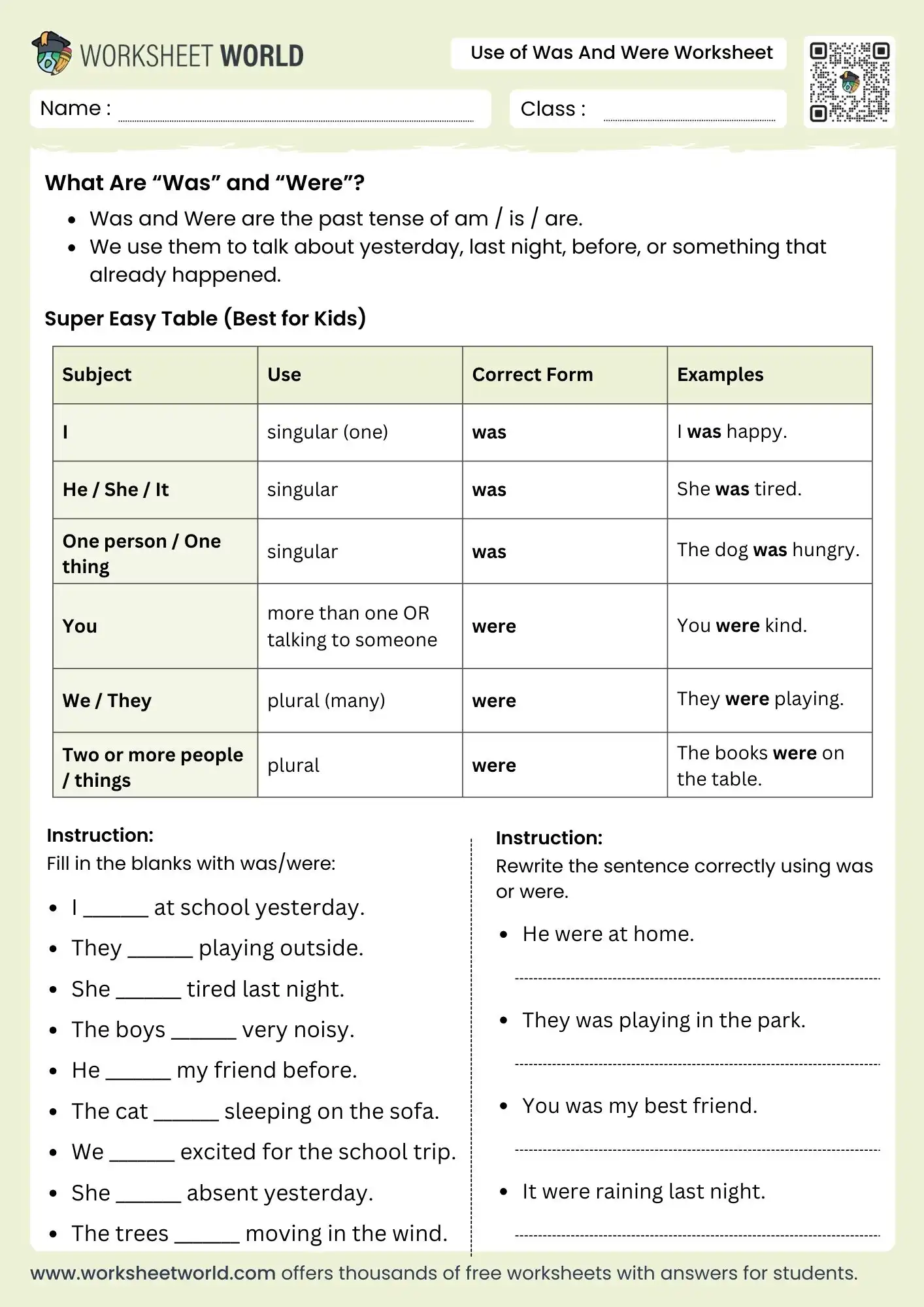 This use of was and were worksheet supports children in choosing the correct past-tense verb through simple and engaging grammar tasks. The activity includes fill-in-the-blanks and correction exercises designed for Classes 2 to 4. With clear explanations and a free PDF, students can strengthen their basic grammar skills effectively.