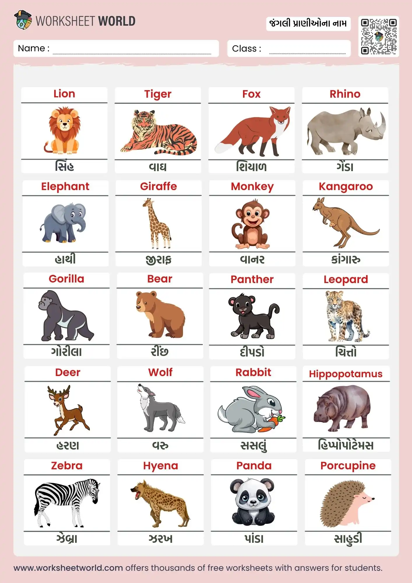 આ વર્કશીટ એક ચાર્ટ સ્વરૂપમાં છે જેમાં વિવિધ જંગલી પ્રાણીઓના ચિત્રો અને નામો બતાવવામાં આવ્યા છે. તેથી અહીં કોઈ પ્રશ્નો કે જવાબો આપવાના નથી. બાળકો ફક્ત જોઈને શીખી શકે છે અને પ્રાણીઓની ઓળખ કરી શકે છે.